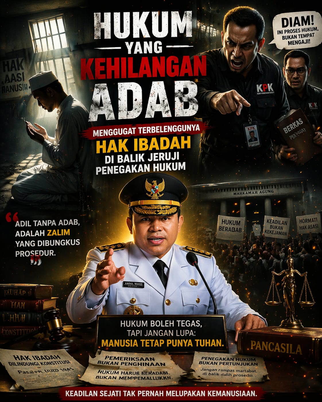 Tindakan menghalangi atau mempersulit ibadah adalah bentuk kezaliman nyata yang kasat mata. Masyarakat tidak hanya melihat Abdul Wahid sebagai sosok politisi, tetapi sebagai sesama Muslim yang hak sucinya sedang dikebiri. Ada pesan moral yang tercederai di sini: bahwa seolah-olah rompi oranye dan borgol besi memiliki kuasa yang lebih besar daripada hak konstitusional untuk bersujud secara layak. Hal ini berisiko menciptakan persepsi publik bahwa penegakan hukum tidak lagi dilakukan dengan hati nurani, melainkan dengan semangat penghakiman yang melampaui batas.