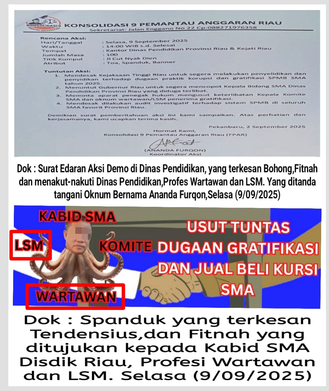 Kali ini di hebohkan oknum yang mengatasnamakan Konsilidasi 9 Pemantau Anggaran Riau, berdasarkan surat edaran adanya aksi demo yang dilaksanakan pada Selasa (9/09/2025) di Kantor Dinas Pendidikan Provinsi Riau, sebagaimana informasi dan surat yang diperoleh awak media pada hari yang bersamaan