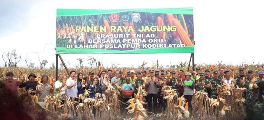 OKU TIMUR || Sinergi TNI AD dan Pemerintah Daerah Kabupaten Ogan Komering Ulu (OKU) membuahkan hasil manis melalui panen raya jagung yang digelar di lahan seluas 285 hektare milik Pusat Latihan Tempur (Puslatpur) Kodiklatad di Desa Kemelak, Kecamatan Baturaja Timur, Jumat (01/08/2025).
