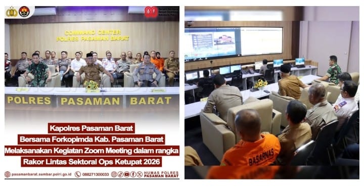 tiraipublik.Com _ PASAMAN BARAT | Suasana serius namun penuh semangat tampak di ruang Command Center Polres Pasaman Barat ketika jajaran Forkopimda Kabupaten Pasaman Barat berkumpul mengikuti rapat koordinasi lintas sektoral melalui Zoom Meeting dalam rangka persiapan Operasi Ketupat 2026. Kegiatan ini dipimpin langsung oleh Kapolres Pasaman Barat AKBP Agung Tribawanto, S.I.K., yang menegaskan pentingnya sinergi seluruh unsur dalam menjaga keamanan masyarakat selama momentum Idul Fitri.