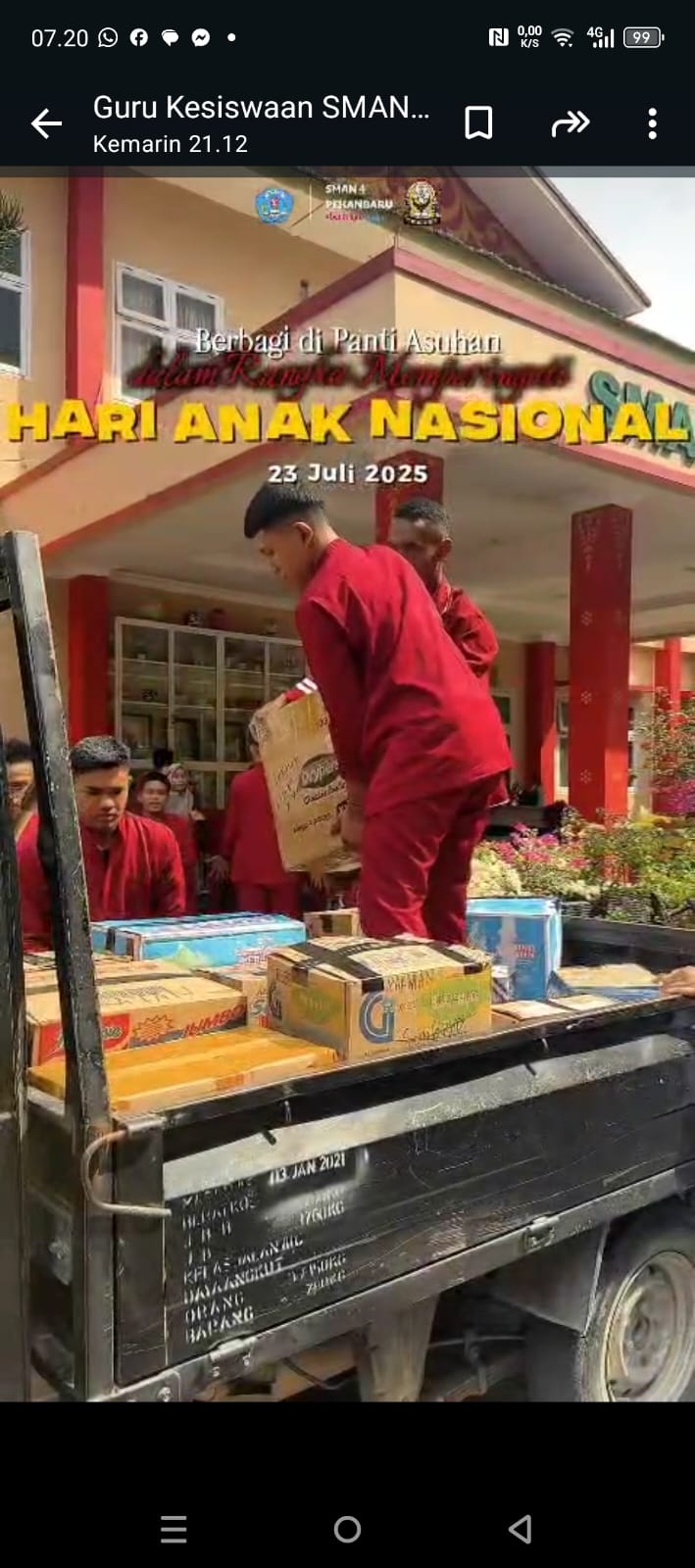 tiraipublik.Com _ Pekanbaru, – Dalam rangka memperingati Hari Anak Nasional, OSIS SMA Negeri 4 Pekanbaru menggelar kegiatan bakti sosial di Panti Asuhan Al Muzakki dan Panti Asuhan Ali An-Nafi’i. Rabu (23/7/2025).