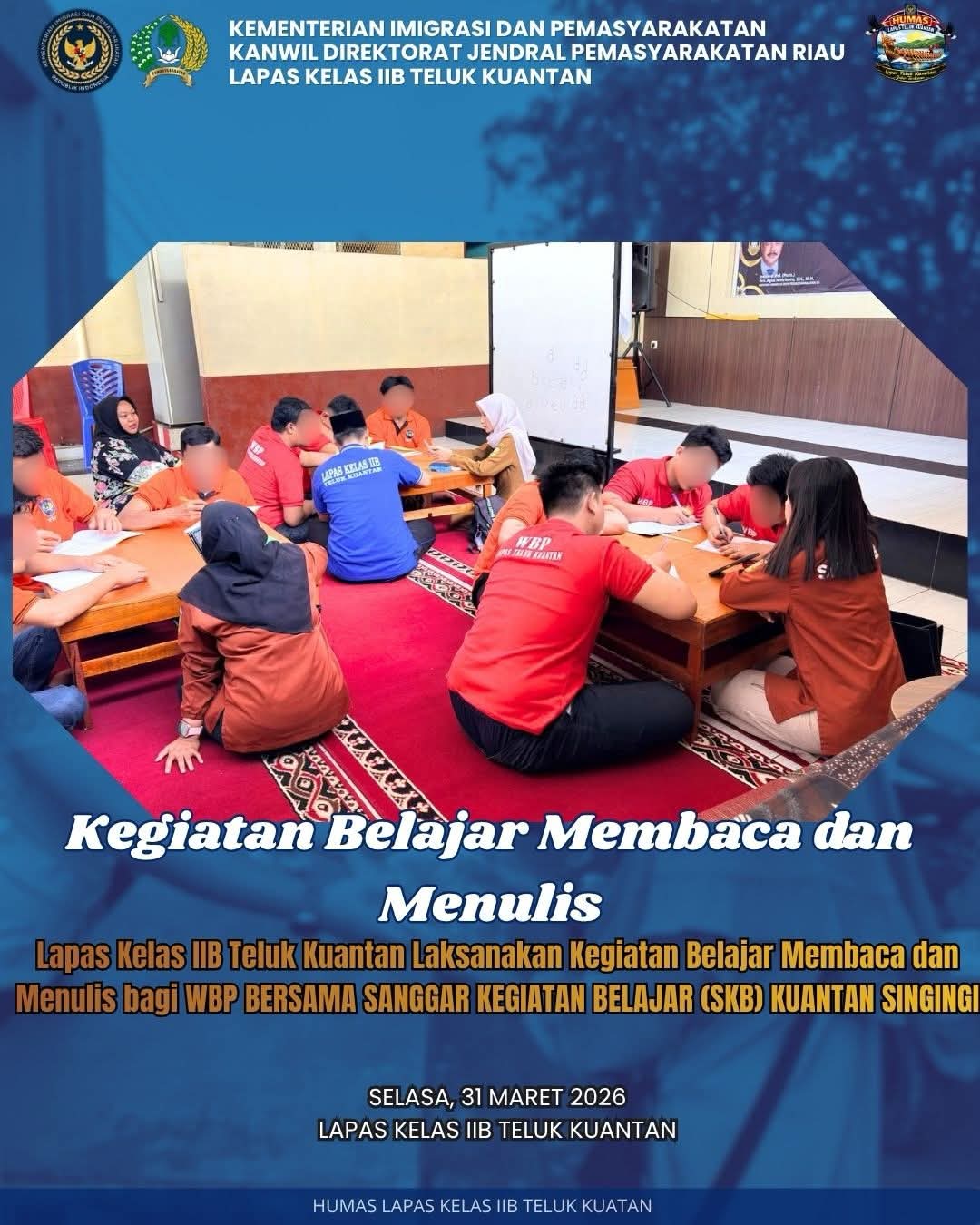 tiraipublik.Com _ TELUK KUANTAN – Upaya meningkatkan kualitas pembinaan terus dilakukan oleh Lapas Kelas IIB Teluk Kuantan. Kali ini, lembaga tersebut menggandeng Sanggar Kegiatan Belajar Kuantan Singingi dalam menghadirkan program pendidikan dasar bagi Warga Binaan Pemasyarakatan (WBP).